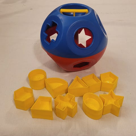 Bolden håndtag elastikken og nogle af klodserne er nye 2 af klodserne har små hakker ses på de sidste billeder D 17 cm, anbefales til børn fra 6 måneder og opefter