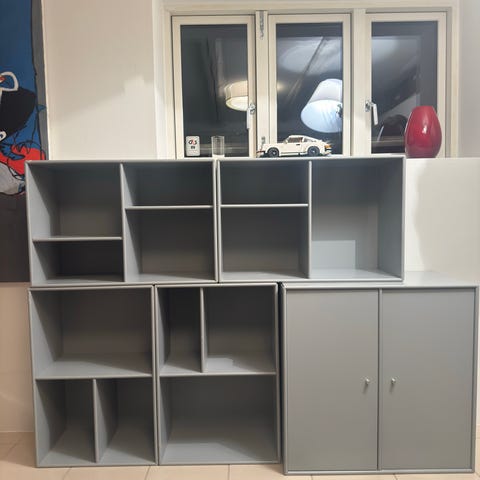 Blå montana modul. Der sidder på indersiden af to af modulets rum små hængsler efter tidligere låger, der ikke medfølger. Brugsslitage og mærker hvilket er afspejlet i prisen.