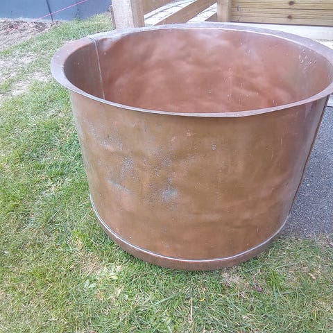 Stor kobber gryde til blomster og den er af ren kobber helt igennem. Der er boret et huld I midten så vand kan rende ud. Flot og med patina.