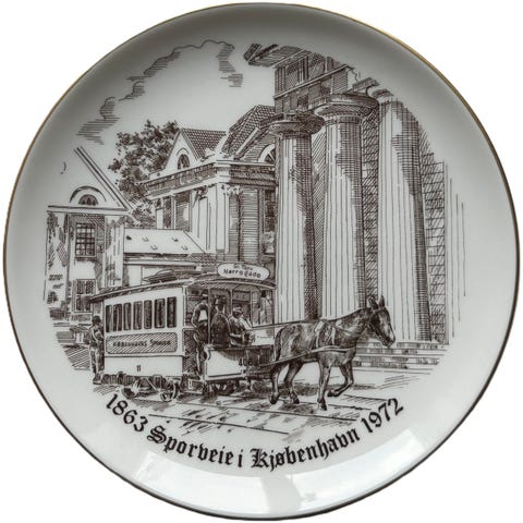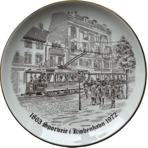 Flot hvid platte fra Bing & Grøndahl med motiv fra Aarhus Sporveie - 1884 - 1895 (hestetrukken sporvogn) i brun stregtegning med guldkant.