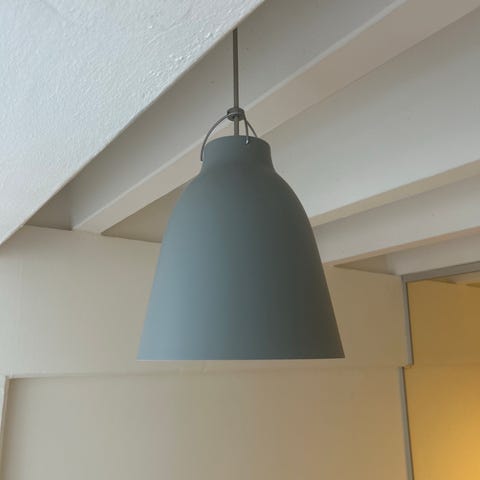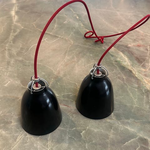 Klassisk sort pendel med hvid inderside og rød ledning. Super fin stand, passet godt på. Lille produktionsfejl på det røde "net" omkring ledningen, deraf prisen. De sælges samlet og prisen er for begge. Nypris 1300 kr/stk.