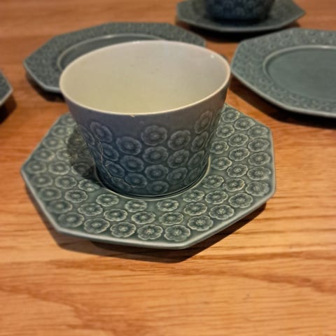 Sekskantet underkop (dia. 15 cm), kagetallerken (dia 17 cm) og ekstra stor kop (diameter 8.8 cm)