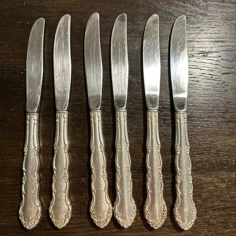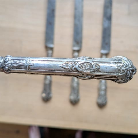 3 mindre sølvplet knive i mønstret Fransk lilje. Muligvis frugknive eller smørknive. Længde 17cm. Selve knivsbladene er let slidte mens skafterne er fine og uden slid på sølvet. Samlet pris kr 50