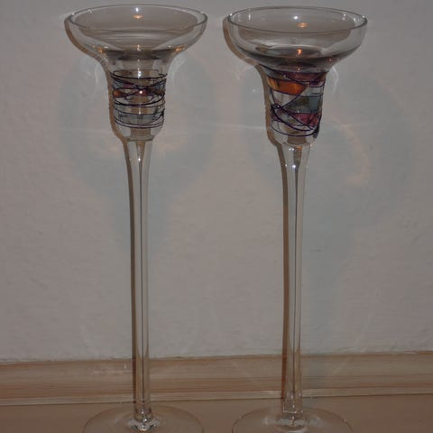 2 smukke glas lysestager eller vaser. Som lysestager passer de til bloklys i flere størrelser eller fyrfadslys.