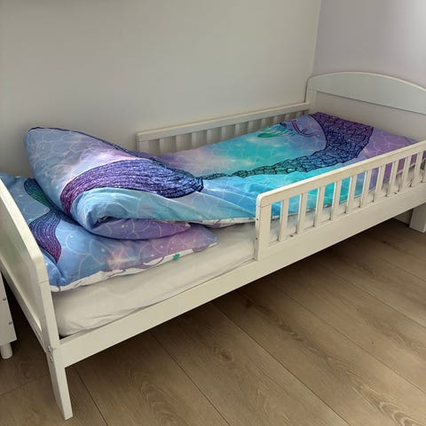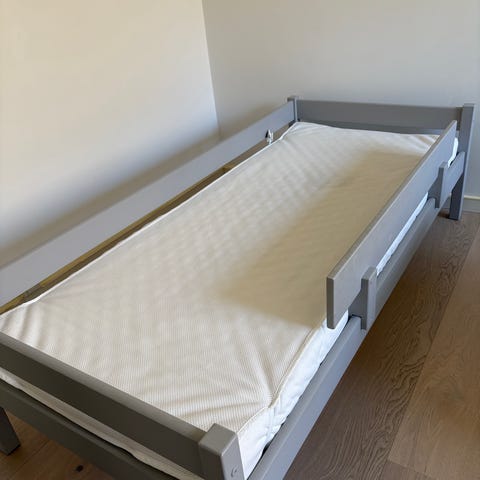 Simpel børneseng i størrelse 70 cm x 160 cm. Nem at skille ad/samle. Madras medfølger ikke.