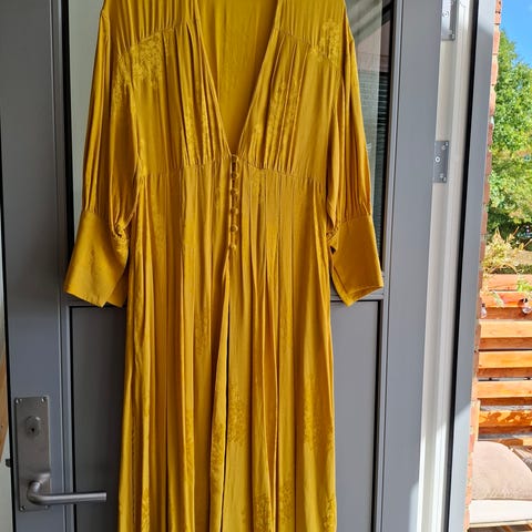 kjole/kimono i gammel rosa farve, størrelse L. Kjolen har knaplukning foran og bælte i taljen. Materialet er blødt og strækbart, velegnet til hverdagsbrug.