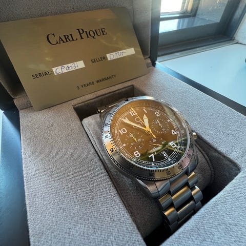 Rustfri stål-lænke er i sølv. Safirglas, Japan movement.