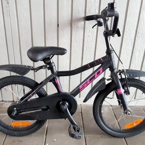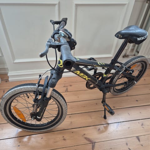 MTB børnecykel med 16" hjul. Cyklen er sort med grønne og lyseblå detaljer. Den har håndbremse foran, skærme for og bag samt reflekser i hjulene. Der medfølger støttehjul, som kan monteres efter behov. Sadel og styr kan justeres i højden, så cyklen kan tilpasses barnets størrelse. Passer børn fra 3 til 5 år.
