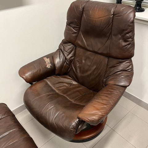 En fodstøtte i læder til Stressless stol eller andet .justerbar ved vip.mørkebrun læder med kirsebær fod.