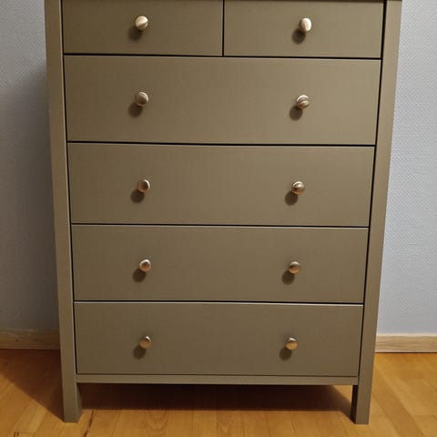 Rigtig fin kommode med 10 skuffer købt i Bauhaus. Er kun brugt til at opbevare strikkegarn i, så den er så god som ny. Hjulene har aldrig været monteret. Nypris 529 kr.