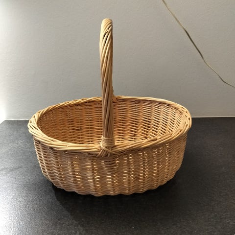 Meget flot og kraftig kurv i flet, måler b 43 cm, d 29 cm, h 28 cm. Kurven har også en bestik bakke i. Alletiders til fx en udflugt.