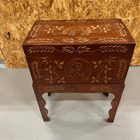 Antik træskrin med flere små rum og et spejl. Skrinet er lavet af træ med en mørk finish og har en rektangulær form. Det indeholder en større opbevaringsplads under låget samt flere små rum til organisering. Spejlet er monteret indvendigt på låget. Skrinet er velegnet til opbevaring af småting og smykker. Skrinet måler B.35,5 cm D. 24,5 cm. H 16 cm.
