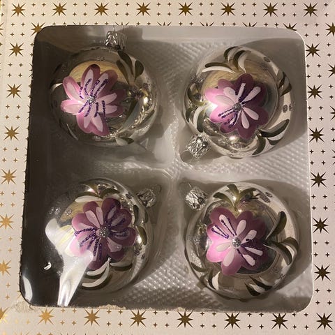 juleklokker i messing, gamle glaskugler og julepynt fra Daells Varehus.