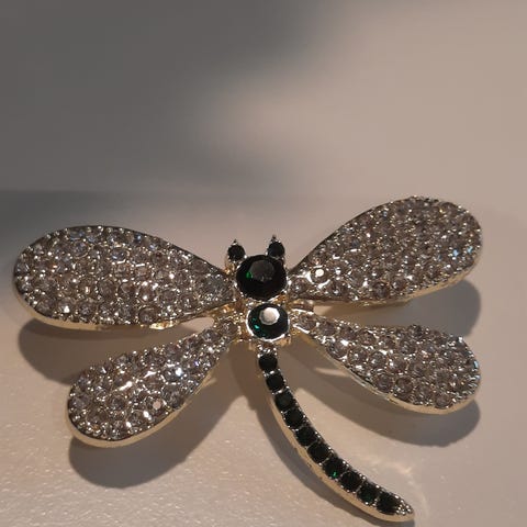 Smuk håndlavet broche i form af en guldsmed. Unikt design med blå og grønne krystaller og perler, syet i hånden. Enestående detaljegrad og kvalitet.