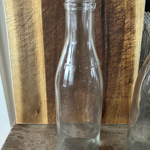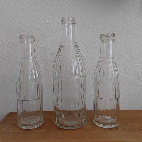 Flasker Mælk Fløde 3 stk. i fin stand, ingen afslag el.l. 1 stk. 1 ltr. + 1 stk. 1/2 ltr. + 1 stk. 1/10 ltr. På alle 3 står MÆLK-FLØDE. Samleobjekt. Se str. i forhold til coladåse på foto 2. Prisen er for alle 3 samlet. Ann. nr. C006