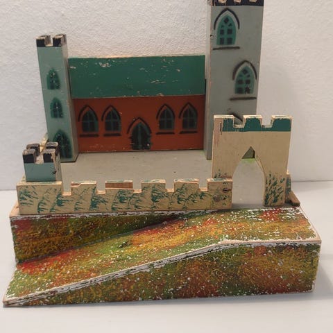 Legetøj, Fængselslegetøj: Sammenklappelig borg nr 38 i kat., Fæstning håndlavet af indsatte i danske fængsler omkring 1930 og solgt gennem Dansk Legetøjsfabrik. Har varenr. 38 i prislisten fra 1933. I fin stand med charmerende aldersrelateret patina. Mål for kasse: (29 x 19,5)cm. Højde 6cm. Højde opklappet 16,5cm.