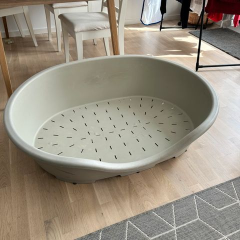 Sort plast hundekurv med en længde på 80 cm. Kurven har ventilation i bunden og er designet med en udskæring på den ene side for nem adgang. Velegnet til hunde som sove- eller hvileplads.