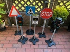 3 trafikskilte / 1 tog alarm og 2 lyskryds sælges . De er beregnet til lege udenfor men kan selvf også bruges inde . Når man trykker på togalarmen så kommer der alarm med lyd . Lyskryds kan indstilles så den er som et alm lysfyr . Altså grøn / kort gul og så rød . Der er samtidig grøn el rød mand til fodovergang . Der er også lyd . Den ene til lyskryds har lidt skader men virker som den skal . De er ca 1 meter høje . De kan pakkes sammen så De ikke fylder ret meget . De sælges samlet for 250kr