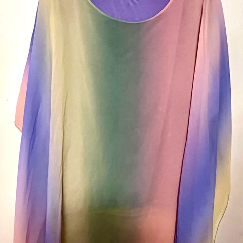 Her har jeg en flot lang skjortekjole i regnbuefarvede har aldrig brugt den der er ovenikøbet prismærke på den endnu den føles forkert på mig og bare har været i skabet det er størrelse L