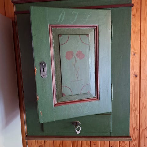 Petrolsgrønt (lidt mere grønt end fotos) med blomsterdekoration og turkis indre💚🩵 Skuffe og to hylder bag lågen. Med beslag til ophæng. Et par små stød på toplisten foran og malingskrab på siden. Se fotos. Ellers i flot stand. H63 B52,5/37 D25 cm. Du kan loppesjoppe det for 425 kr.
