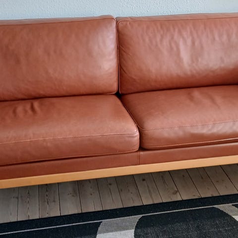 Svensk design. Erik Merthen sort 3-personers lædersofa og mørkt bejset træ. Fine detaljer i læder med spænder bagpå. Meget stilfuld og i design fra 1960’erne. Sofaen har et let udtryk og passer godt ind i alle rum. Sofaen har spænder på både læder og træ (se billeder). Der er foretaget en mindre reparation af det venstre armlæn, som er blevet fastgjort. Se også min anden annonce med tilhørende sofabord.