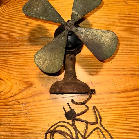 Ventilator, Antik, Antik lille ventilator til pynt på en hylde. Er ikke sikker på den virker. En af vingerne er knækket, men kan nemt loddes på igen.