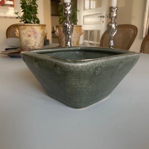 Royal Copenhagen, lille trekantet glaseret stentøjs skål. Design af Bose Willumsens. Nr. 20162. 1. Sortering.