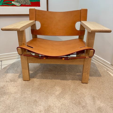 Den spanske stil af Børge Mogensen med sort læder og sæbebehandlet eg. Fin stand.