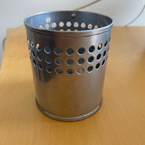Rund pulverlakeret metal beholder i dyb blå farve. Med perforeret huller langs den øvre del, hvilket gør den velegnet til opbevaring af køkkenredskaber eller som penneholdere. Dimensionerne er 10 cm i højde og 8 cm i diameter