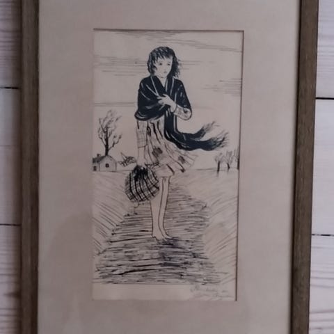 Kunstner/tegner: ”MW”. ”Mar Weir”? Tekst: ”Brun fink”? Årstal ukendt. Erhvervet af forældre i 1980´erne – 1990´erne. Fået af forældre senere.