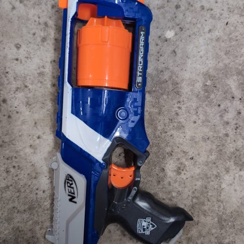 Nerf Rhinofire, Nerf, Super kraftig batteridrevet dobbeltløbet tromleskyder med plads til 25 små skumpile i hver tromle.