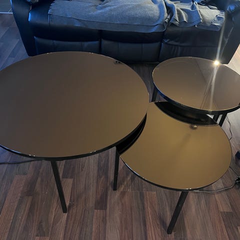 2 smukke ens borde i kobberfarvet metal og med bordplade i spejlglas. De er utrolig elegante og har få brugsspor. Meget smukke som sideborde til sofa eller som ens natborde. Højden er 46 cm og ø er 48 cm.