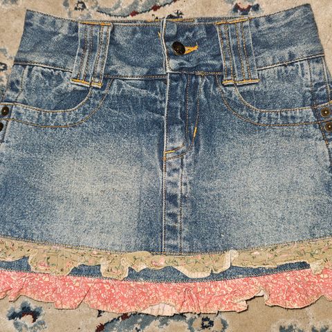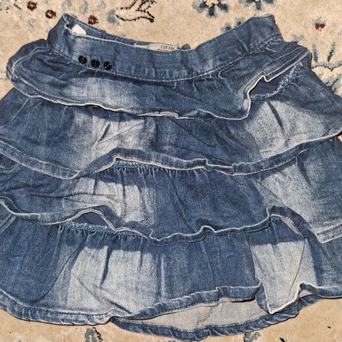 Brugt en gang. Denimnederdel i str. 13-14 år. Kan spændes ind i taljen. Sender gerne.