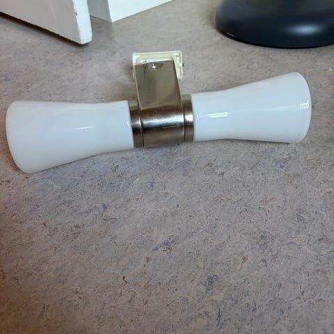1 stk. brugt IKEA væg eller loftlampe med mundblæs opal lampeglas og med med porcelæn i lampedelen på væggen og med en alu kappe på.