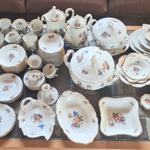 I prisen er der taget højde for lidt skavanker. Men overordnet ser det meste flot ud med intakt guldkant. Altid vasket op i hånden...