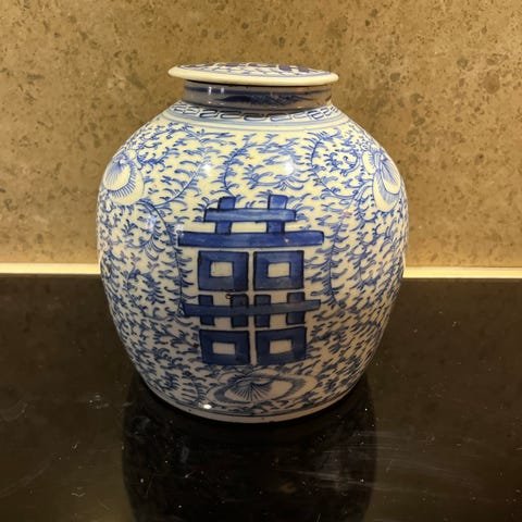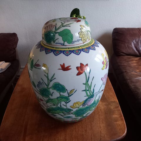 Ældre kinesisk bojan, Meget flot Bojan med låg flot fugle blomstermønster 30 cm høj. Der er 2 stk og prisen er pr stk