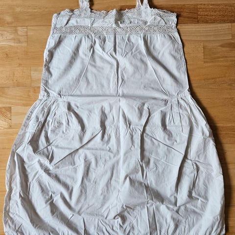 Sommerkjole, bomuld, 0 år gl., kjolen er str L.men det må være en lille LDen er ny og den har aldrig været brugt. Den er sød på.Billedet kan desværre ikke rigtigt vise, hvor feminin, kjolen er.Den har en bred elastik i taljen og flæsekant forneden. Du er velkommen til at komme og prøve kjolen.Det er et besøg værd, synes jeg.Se endelig mine øvrige annoncer. Der er mange gode tilbud!