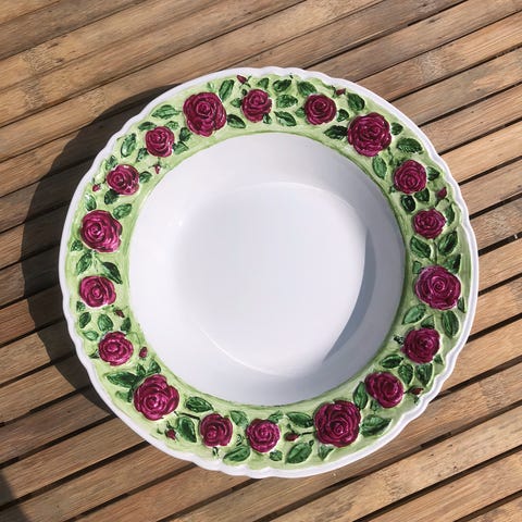 Fad, Italiensk, Stort fad i kunststof Ø41cm, højde 5cm. Made in Italy. Aldersrelaterede spor på den røde flade. (2458)