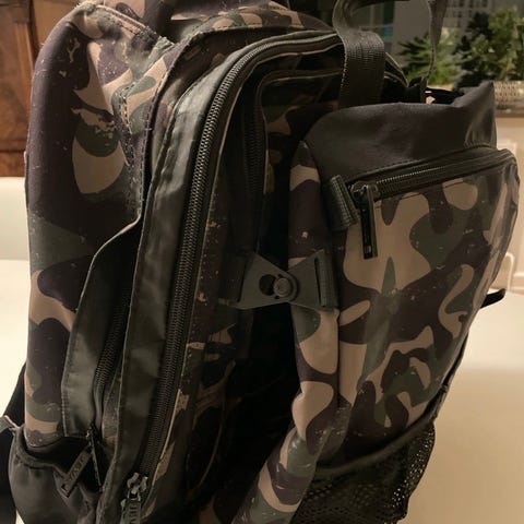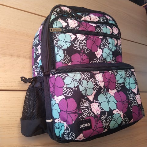 I fin stand. Mange gode rum og gode polstrede remme til at cykle med. Pose til idrætstøj medfølger og kan sættes fast på tasken.