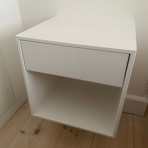 Artek Alberto Meda natbord i hvidt træ. Natbordet har en skuffe og et bordplade med en rund kant. Designet af Alberto Meda for Artek, velegnet til opbevaring ved sengen.