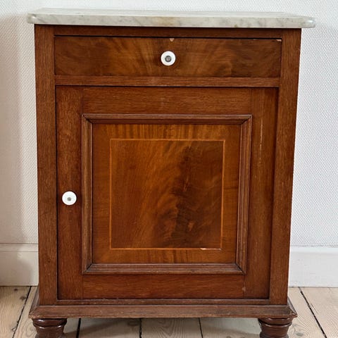 Gammelt skab med marmorplade og det oprindelige beslag.