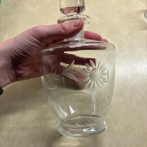 Håndmalet glas og karaffel, anvendes f.eks til hjemmelavet snaps m.v.
