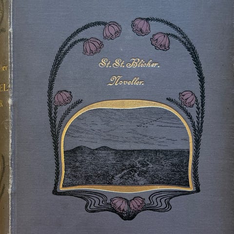 Udvalgte noveller af st. St. Blicher. , Sten stensen Blicher , genre: noveller, Bogen er fra forlaget Gyldendal fra 1899 på 802 sider og måler 20 x 29 cm. Den er indbundet og illustreret af Carl Thomsen ,med ex libris i.