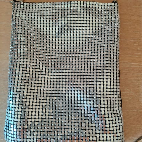 Selskabstaske i sølv skinnende sten og sort satin. Også sølv metal skulderrem. Måler 15x11 cm. (Til mobil m.m.). Tryklås. Mrk. Lancôme. Meget fin og ubrugt. Se div. foto. Prisen er fast, med mindre køb af andet. KAN OGSÅ SENDES.