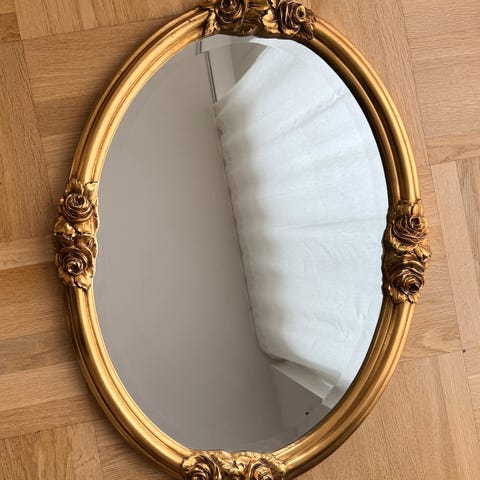 Nyere oval facetslebet spejl med guldramme. 65 cm høj ( tlf 40444299 (ikke SMS )