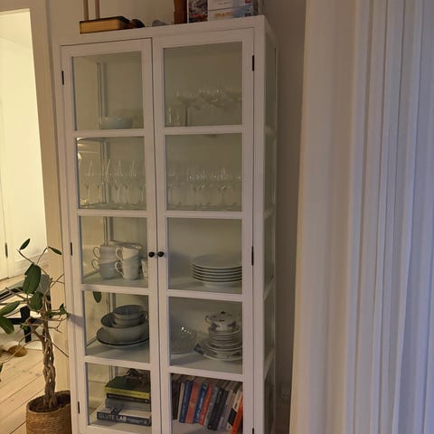 Væghængt vitrineskab. Hænger aktuelt på væggen, så I skal selv tage det ned. Ret fint.