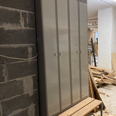 Hatteskab / ærøskab / skilleskab /søjleskab, med helsøjler og buede låger