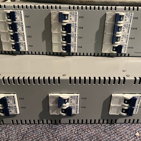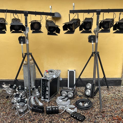 16 stk. Ultralite Par 64 på alurør med beslag til alubro montering. Showtec D-pack 6 mkii dimmer pack i flightcase - En fungerende dimmer og en defekt - kan muligvis repareres.