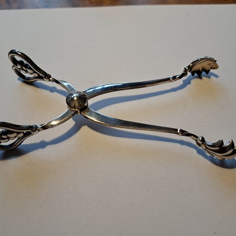 Elegant og sjældent stykke sølvtøj fra Georg Jensen & Wendel A/S, fremstillet i perioden 1945–1951, i det klassiske Dronning Acanthus-design, model nr. 174. Tangen er udført i sterling sølv og måler 10,5 cm i længden. Den bærer både Georg Jensens stempler og svenske importstempler, hvilket dokumenterer dens oprindelse og eksporthistorik.