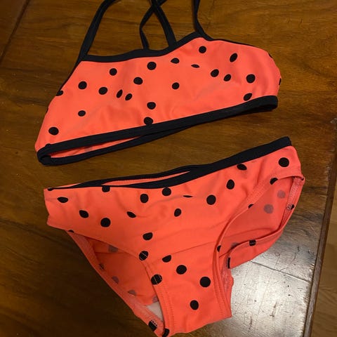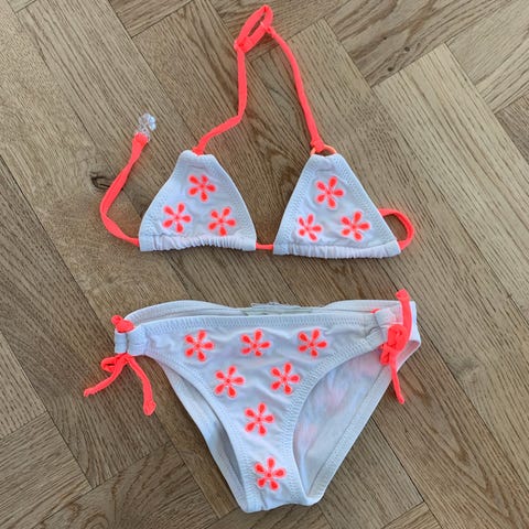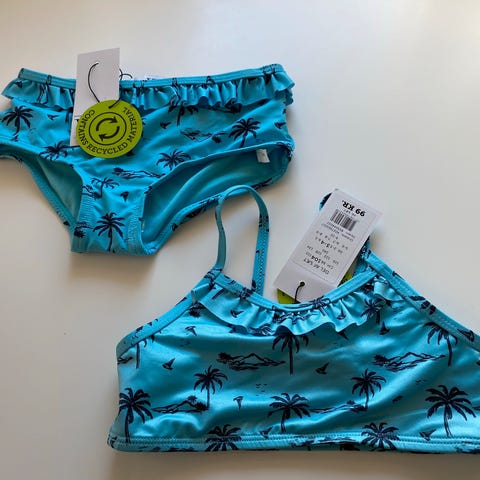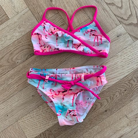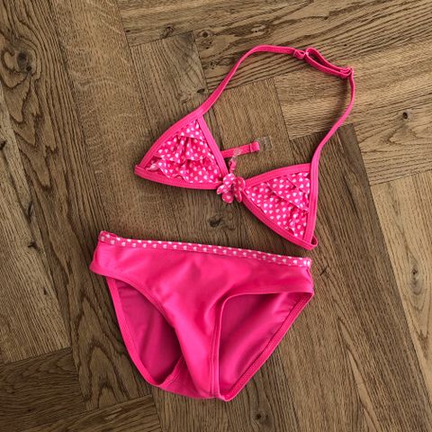 Sød bikini i str 5-6 år. Brugt en del, da min datter elskede den. Fnuldret bagpå og lidt affarvet.